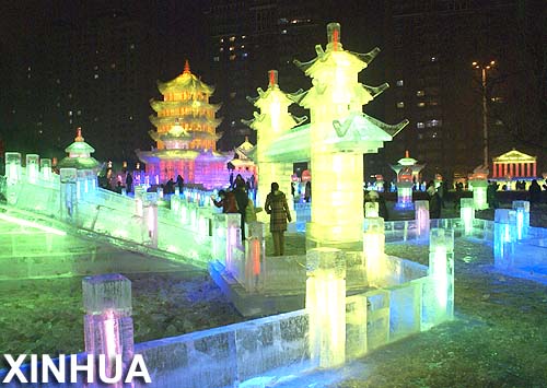 Con un área de 40 hectáreas, el Mundo de Hielo y Nieve, que usa 120.000 metros cúbicos de hielo y 100.000 metros cubicos de nieve, se abrió al público el domingo. (Xinhua)25/12/2007